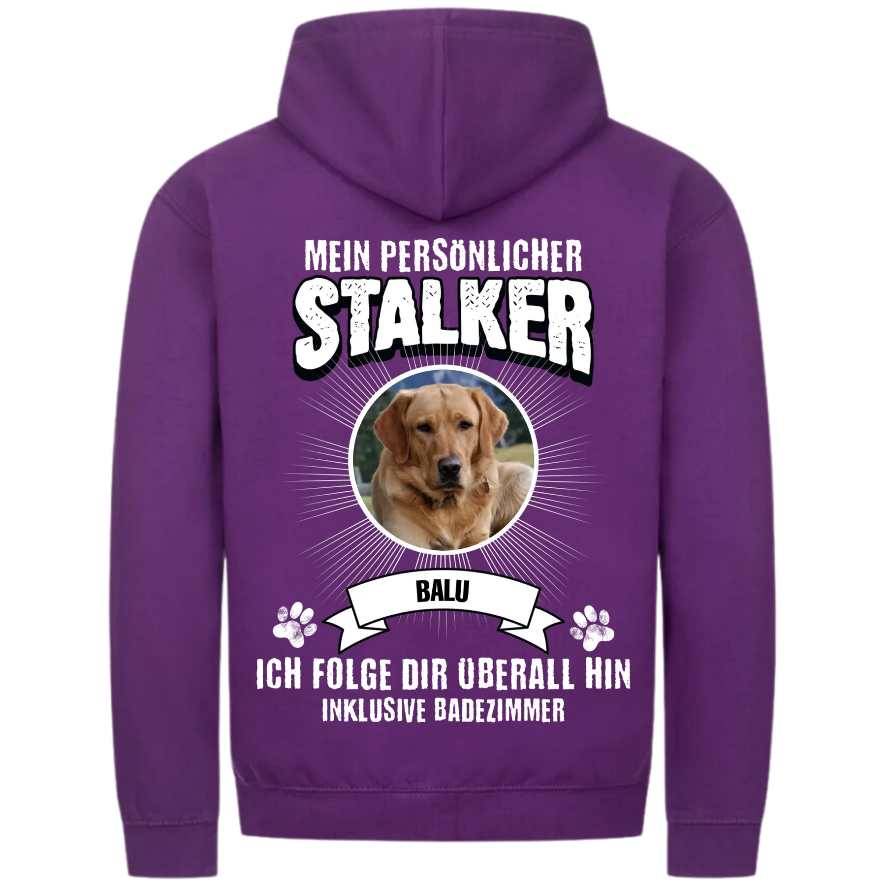 Entdecke den perfekten Kapuzen Pullover für Hundeliebhaber, die auch in der kalten Jahreszeit nicht auf Humor und Komfort verzichten wollen! Unser "Mein persönlicher Stalker" Hoodie ist ideal für gemütliche Spaziergänge mit deinem Hund – selbst bei frostigen Temperaturen. Mit dem witzigen Spruch "Ich folge dir überall hin. Auch ins Badezimmer" und einem personalisierten Bild deines treuen Vierbeiners auf der Vorderseite, wird dieser kuschlige Hoodie schnell zu deinem neuen Lieblingsstück im Kleiderschrank.
